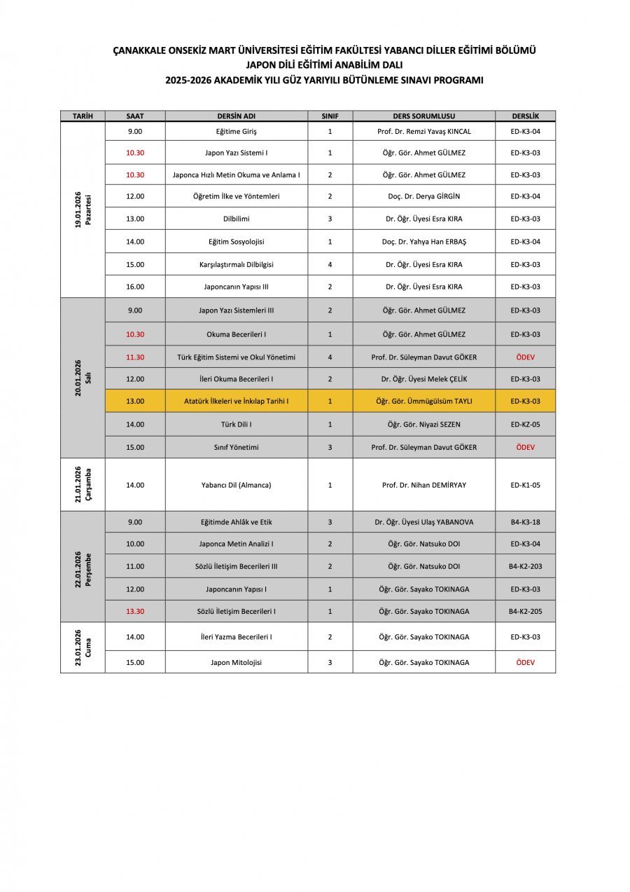 2025-2026 Akademik Yılı Güz Dönemi BÜTÜNLEME Sınav Programı ilan edildi.